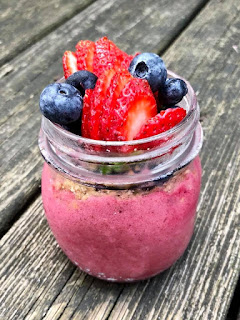 Smoothie Parfait for my afternoon dessert ๐☀️๐๐ (Blend 2 ripe frozen bananas, beet powder, crushed walnuts, and garnish with berries)
